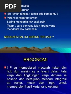 Produktivitas kerja dan ergonomi di perusahaan garmen a. Pendahuluan industri garmen sebetulnya mempunyai prosfek yang cukup cerah dalam membangun perekonomian masyarakat, namun krisis ekonomi belakangan ini banyak industri garmen yang gulung tikar dan memberhentikan karyawannya (phk) oleh karena mereka tidak mampu … Tujuan ergonomi sendiri untuk meningkatkan produktivitas karyawan dengan bekerja pada posisi yang aman dan nyaman. Tidak terdapat hubungan signifikan antara penerapan ergonomi dengan produktivitas kerja, dapat dilihat dari nilai p value yaitu 0,911 (p value > 0,05) yang menunjukkan bahwa tidak ada hubungan antara variabel independent dengan variabel dependent. Pengertian ergon = kerja nomos = aturan ergonomi = aturan/tatacara dalam bekerja (secara harfiah) ergonomi adalah ilmu yang mempelajari manusia dalam hubungan dengan pekerjaan, dengan segala aspek dan ruang …