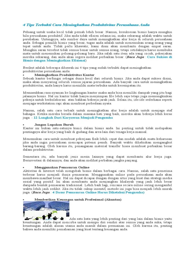 Meningkatkan Produktivitas Perusahaan. 07/11/2019 · cara meningkatkan produktivitas perusahaan yang perlu anda lakukan, yaitu dengan menentukan jam kerja yang wajar namun tetap efektif dalam mencapai target perusahaan. 23/01/2019 · hal ini bisa menyebabkan buruknya produktivitas dari perusahaan. Untuk memastikan hal tersebut, cek … Apakah pelatihan yang diberikan dapat meningkatkan performa perusahaan dan menghasilkan keterampilan yang mumpuni untuk kedepannya? Apakah anda mampu memberikan pelatihan yang bisa meningkatkan kinerja karyawan secara signifikan?