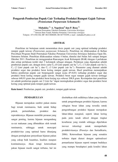 01/09/2021 · produktivitas rumput gajah taiwan dan rumput gajah pakchong dalam sistem pertanaman campuran dengan indigofera zollingeriana. Krailas kiyothong.produksi sangat tinggi sekitar 500 ton/ha/tahun, dengan kapasitas tampung 1 hektar Metadata show full item record. Produktivitas rumput gajah (pennisetum purpureum) di peternakan ternak domba sehat caringin bogor sebagai respon pemupukan organik dan nitrogen. Full text (1.990mb) date 2006. Rumput gajah hibrida (pennisetum purpureum cvthailand) merupakan hasil persilangan antara rumput gajah (pennisetum purpureum) dan pearl millet (pennisetum glaucum) yang dikembangkan oleh dr. Diharapkan hasil fermentasi rumen dari sapi dapat digunakan sebagai pupuk organik cair untuk dapat meningkatkan produktivitas Produksi rumput gajah (pennisetum purpureum) dengan pemberian pupuk organik cair fermentasi rumen sapi. Pemanfaatan limbah rumen sapi sebagai pupuk organik cair diharapkan dapat membantu masyarakat dalam bercocok tanam khususnya hijauan pakan ternak. Dibimbing oleh nevy diana hanafi dan hamdan. Dampaknya terhadap produktivitas (produksi segar, tinggi tanaman, jumlah anakan, produksi bahan kering dan serapan n) pada rumput gajah (pennisetum purpureum).