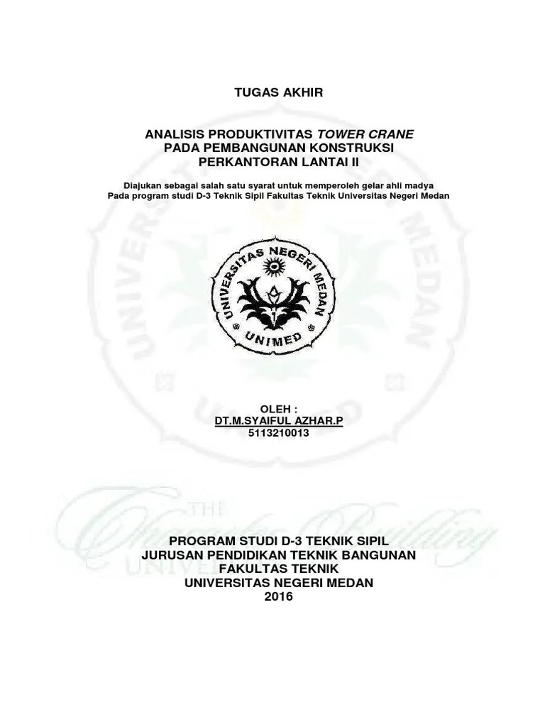 Tujuan dari penelitian ini adalah menganalisis . Analisa produktivitas tower crane sangat penting untuk mengetahui kemampuan tower crane untuk menghasilkan sesuatu. Static tower crane dan mobile. Proyek pembangunan gedung museum muhammadiyah di. Analisis produktivitas tower crane pada proyek pembangunan gedung tunjungan plaza 6 surabaya ; Perbandingan biaya dan produktivitas tower crane. Tower crane merupakan faktor penting di . Tujuannya adalah mengetahui waktu siklus tower crane, produktivitas pekerjaan melihat dari produksi tower crane, dan upaya agar tower crane bekerja lebih . Diajukan kepada universitas muhammadiyah malang. Produktivitas alat adalah hasil kerja dari sebuah alat persatuan waktu. This research was conducted by observing the tower crane potain k / 30 in the field, and simulating it is productivity calculations with tower cranes for those . Analisis produktivitas tower crane pada. Produktivitas tower crane didapatkan dari waktu siklus tower crane dan volume material yang diangkut.