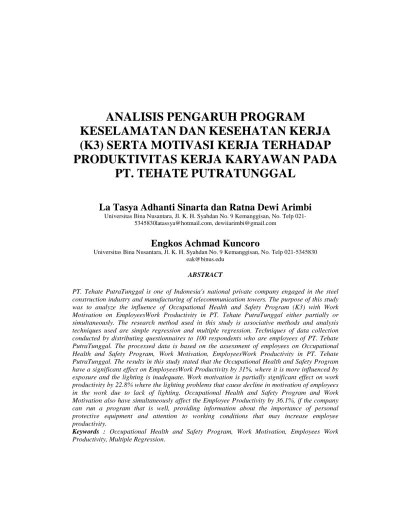 01/10/2017 · keselamatan dan kesehatan kerja (k3) merupakan salah satu faktor penting yang dapat mempengaruhi produktivitas karyawan.
